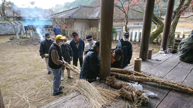 師走の12月13日日曜日、栗ヶ畑区の「栗ヶ畑シニアクラブ」では、栗ヶ畑神社のしめ縄つくりを行いました。 豊後大野市でコロナウイルス陽性者が発生した状況下当シニアクラブの忘年例会は中止となりました。 例年実施している栗ヶ畑神社のしめ縄つくりは、男性メンバーのみで皆さんマスク着用で予定通り実施して立派なしめ縄を作成できて神社の新年を迎える準備が無事終了しました。