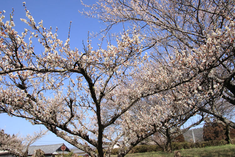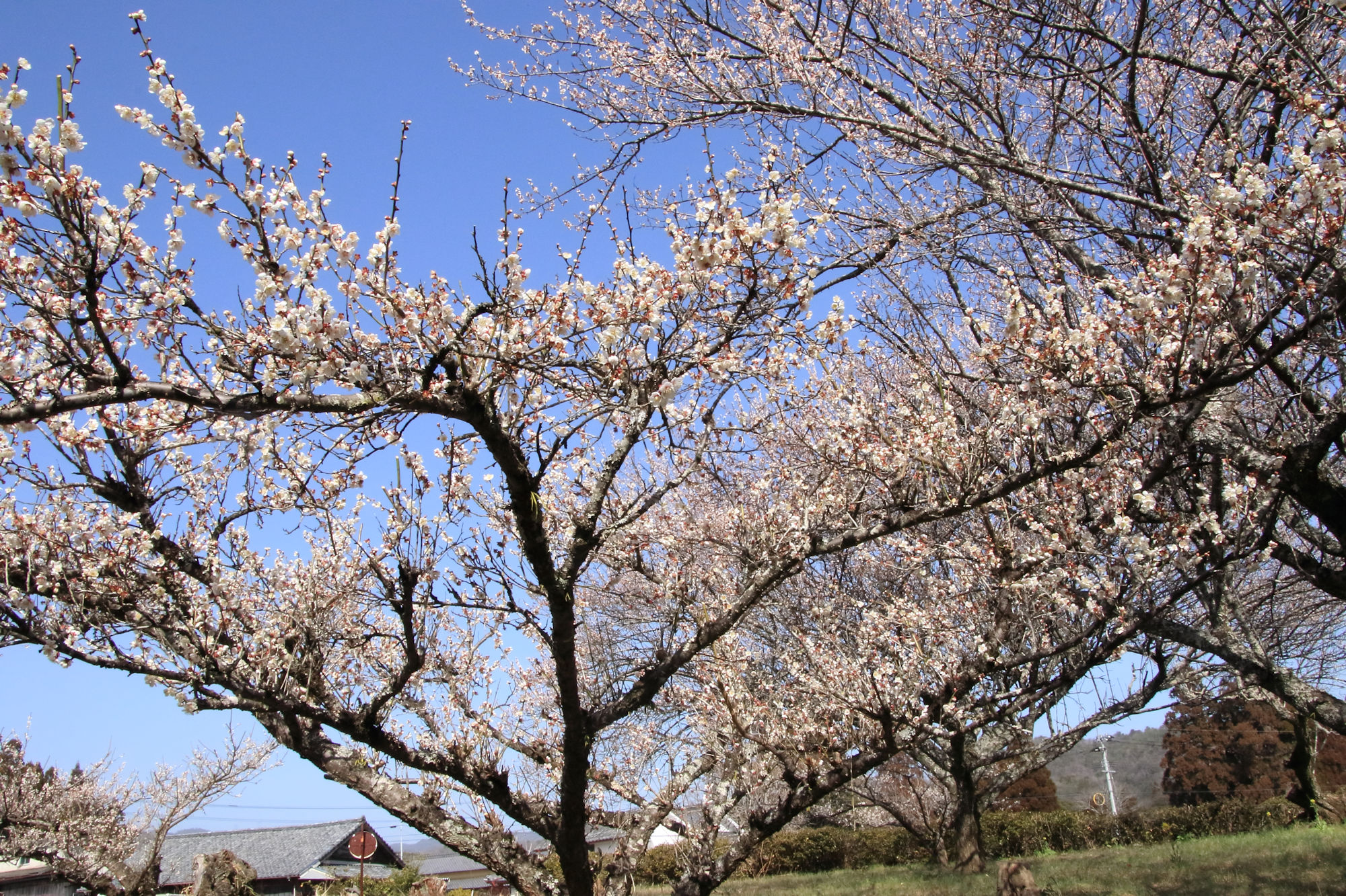令和8年02月23日、2月なのに4月の様な暖かな祝日、長谷地区長畑区の梅園の梅の花が満開できれいです。 手入れされた梅の巨木の新芽からの花は梅の枝と調和して日本的な美しさです。