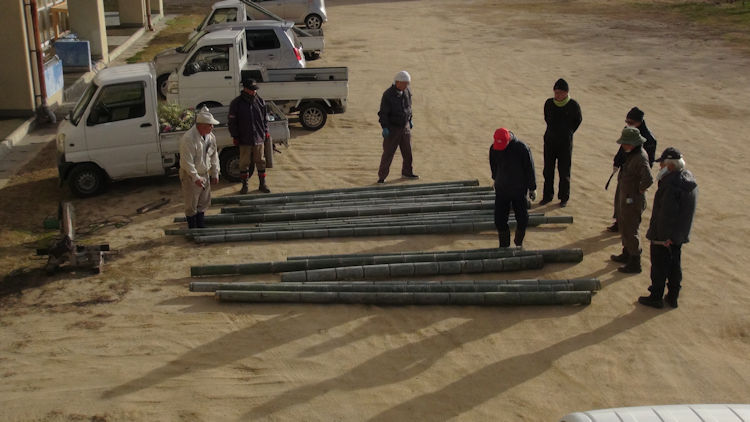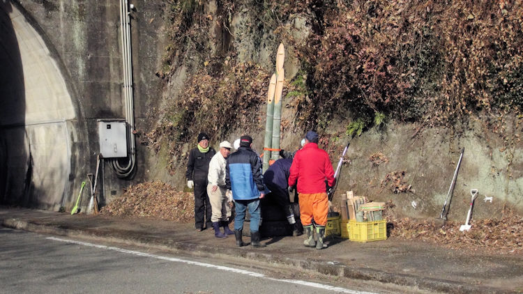令和2年12月20日 長谷入口にて [自動スライド表示]拡大写真 動画閲覧 師走20日の日曜日、長谷地区の上三青年会(稗田基雄会長)の皆さんが長谷の入口に門松を設置してくれました。 会のメンバーは早朝に高津原区の竹林で孟宗竹の切り出しを行い、旧長谷小学校グランドにて門松用に竹の加工後長谷入口に移動して門松作成を行いました。 おかげで、長谷地区の入口の長谷トンネル前に新しい年を迎える立派な門松が設置されました。